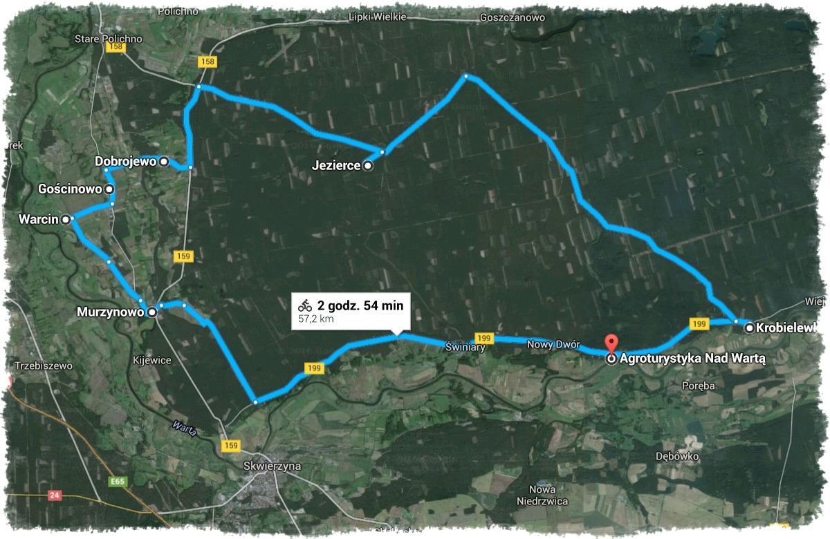 - Trasa 5 – 57 km – Agroturystyka nad Wartą – Krobielewko – Jezierce – Dobrojewo – Gościnowo – Warcin – Murzynowo – Świniary – Agroturystyka nad Wartą